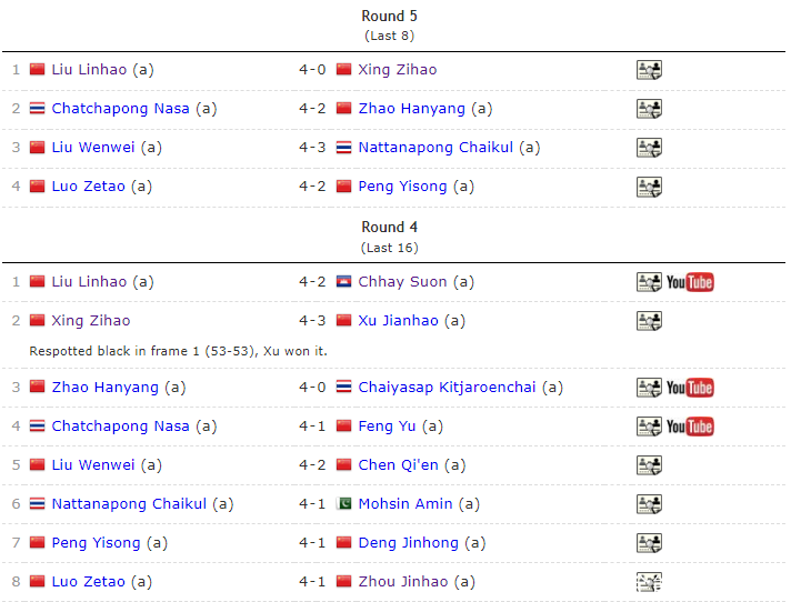 第四轮约束后,共有中国选手晋级8强,他们是本赛季刚刚跌出干事赛的邢子豪,以及罗泽涛、彭奕淞、刘文炜、刘林昊、赵翰洋。略有缺憾的是,田鹏飞、马海龙两位前干事选手在前两轮出局。